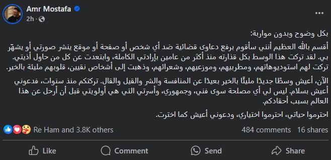 واستكمل عمرو مصطفى: "الآن أعيش وسطًا جديدًا مليئًا بالخير بعيدًا عن المنافسة والشر والقيل والقال. تركتكم منذ سنوات، فدعوني أعيش بسلام".