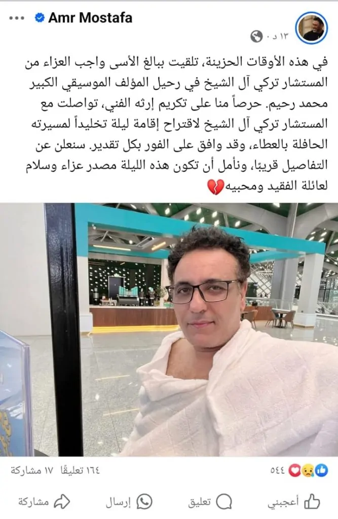 وكتب عمرو مصطفى: "في هذه الأوقات الحزينة، تلقيت ببالغ الأسى واجب العزاء من المستشار تركي آل الشيخ في رحيل المؤلف الموسيقي الكبير محمد رحيم".