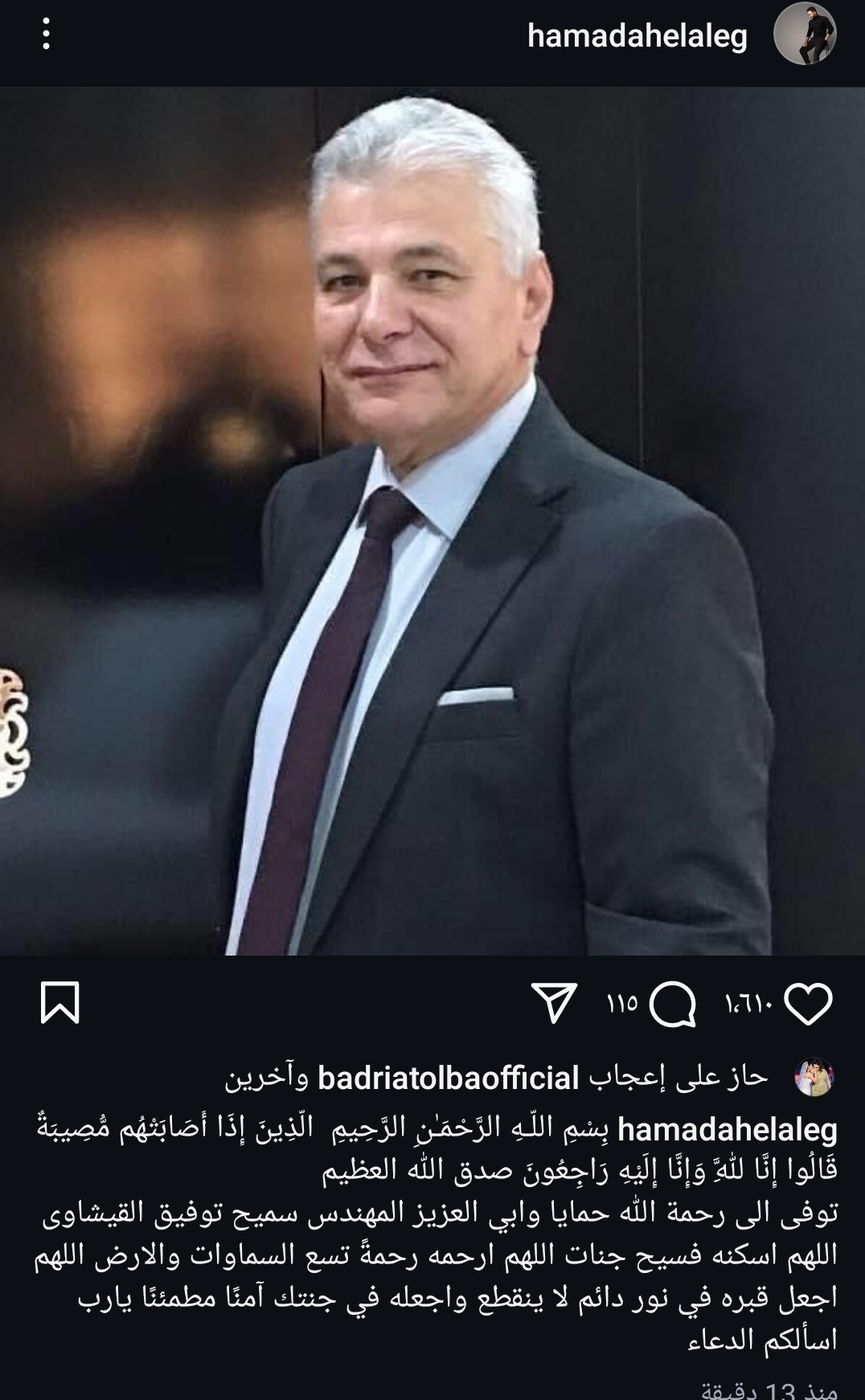 أعلن الفنان حمادة هلال منذ قليل عن وفاة حماه ووالد زوجته المهندس سامح توفيق الفيشاوي، وذلك عبر حسابه الشخصي بموقع تبادل الصور والفيديوهات “انستجرام”.