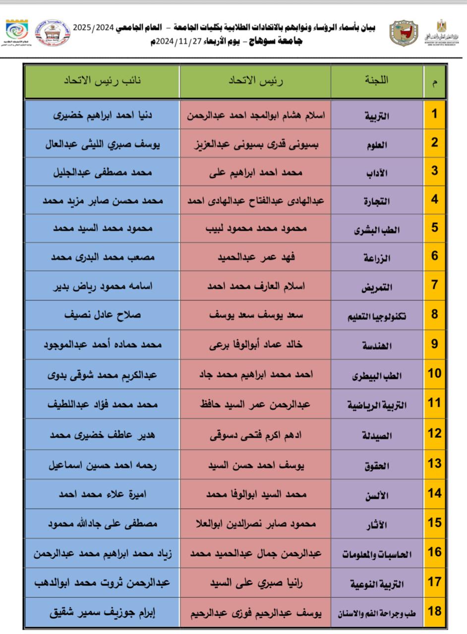 ورحمة أحمد حسين نائبا له، وبكلية الألسن فاز الطالب محمد السيد ابو الوفا برئاسة الاتحاد، وأميرة علاء محمد نائبا له، وفي كلية الآثار تم إعلان الطالب محمود صابر نصر الدين رئيسا للاتحاد، ومصطفى علي جادالله نائب له، وبكلية الحاسبات والمعلومات اعلان الطالب عبد الرحمن جمال عبدالحميد رئيسا للاتحاد، وزياد محمد ابراهيم نائبا له، وفي كلية التربية النوعية فازت الطالبة رانيا صبري علي برئاسة الاتحاد، وعبد الرحمن ثروث محمد نائبا لها، واخيرا بكلية الأسنان فاز الطالب يوسف عبد الرحيم فوزي برئاسة الاتحاد، وإبرام جوزيف سمير نائبا له