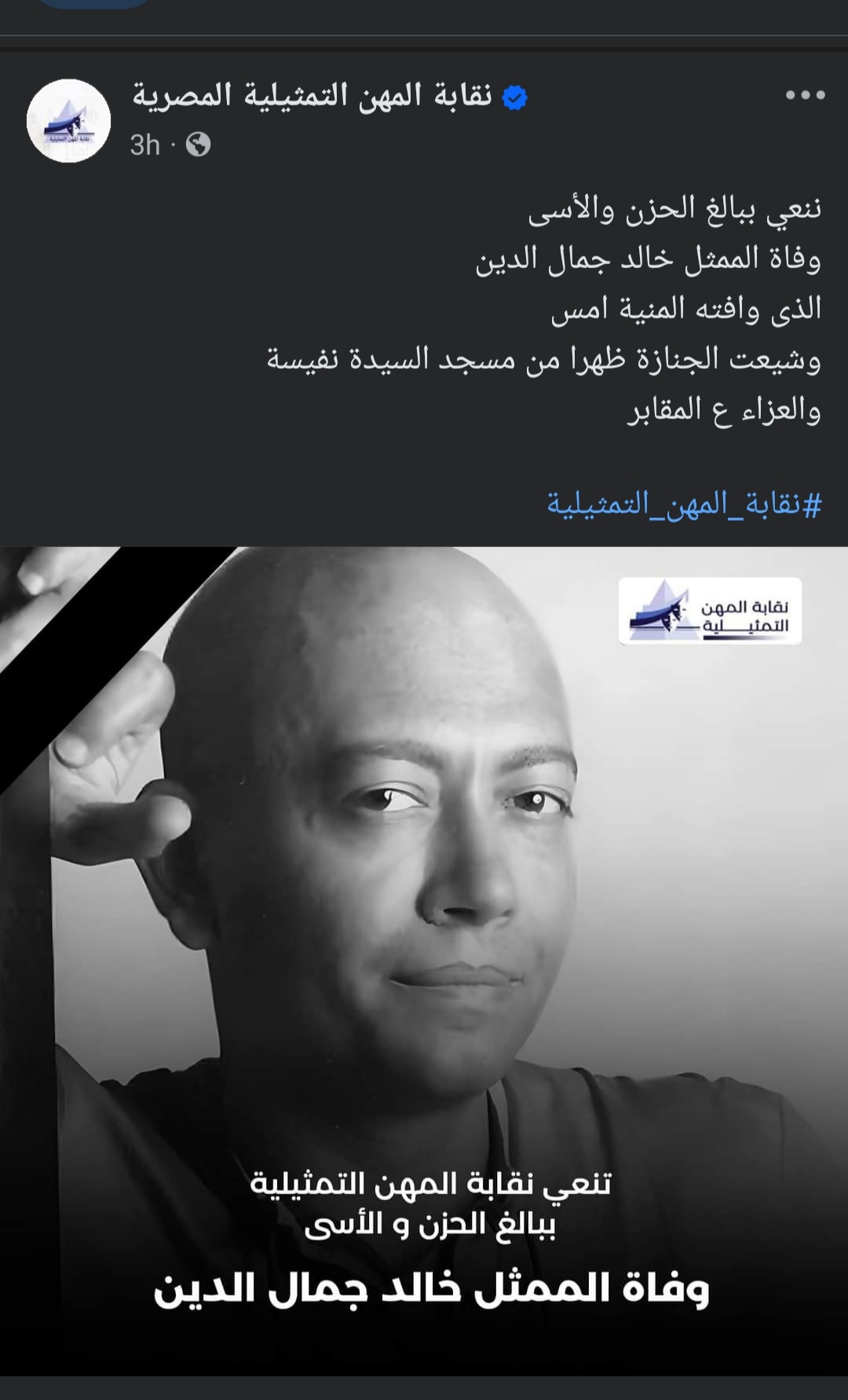وقد أعلنت النقابة عبر صفحتها الرسمية على "فيسبوك" عن وفاة الفنان خالد جمال الدين الذي وافته المنية صباح اليوم، وتم تشييع جثمانه ظهرًا من مسجد السيدة نفيسة، على أن يكون العزاء في المقابر.