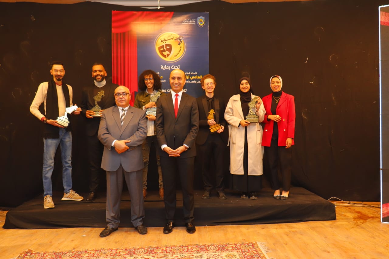كرم الدكتور إلهامي ترابيس - رئيس جامعة دمنهور ، والدكتور  ماجد شعلة -  نائب رئيس الجامعة لشئون التعليم والطلاب، الطلاب الفائزين بمهرجان بؤرة المسرحي في دورته الثانية المنعقد بمسرح المدرج بكلية العلوم، بإشراف الإدارة العامة لرعاية الطلاب برئاسة الدكتور محمد عشري، ومحمد الشعيرة - مدير إدارة النشاط الفني ومدير المهرجان، وممثلي أقسام رعاية الطلاب بالكليات.