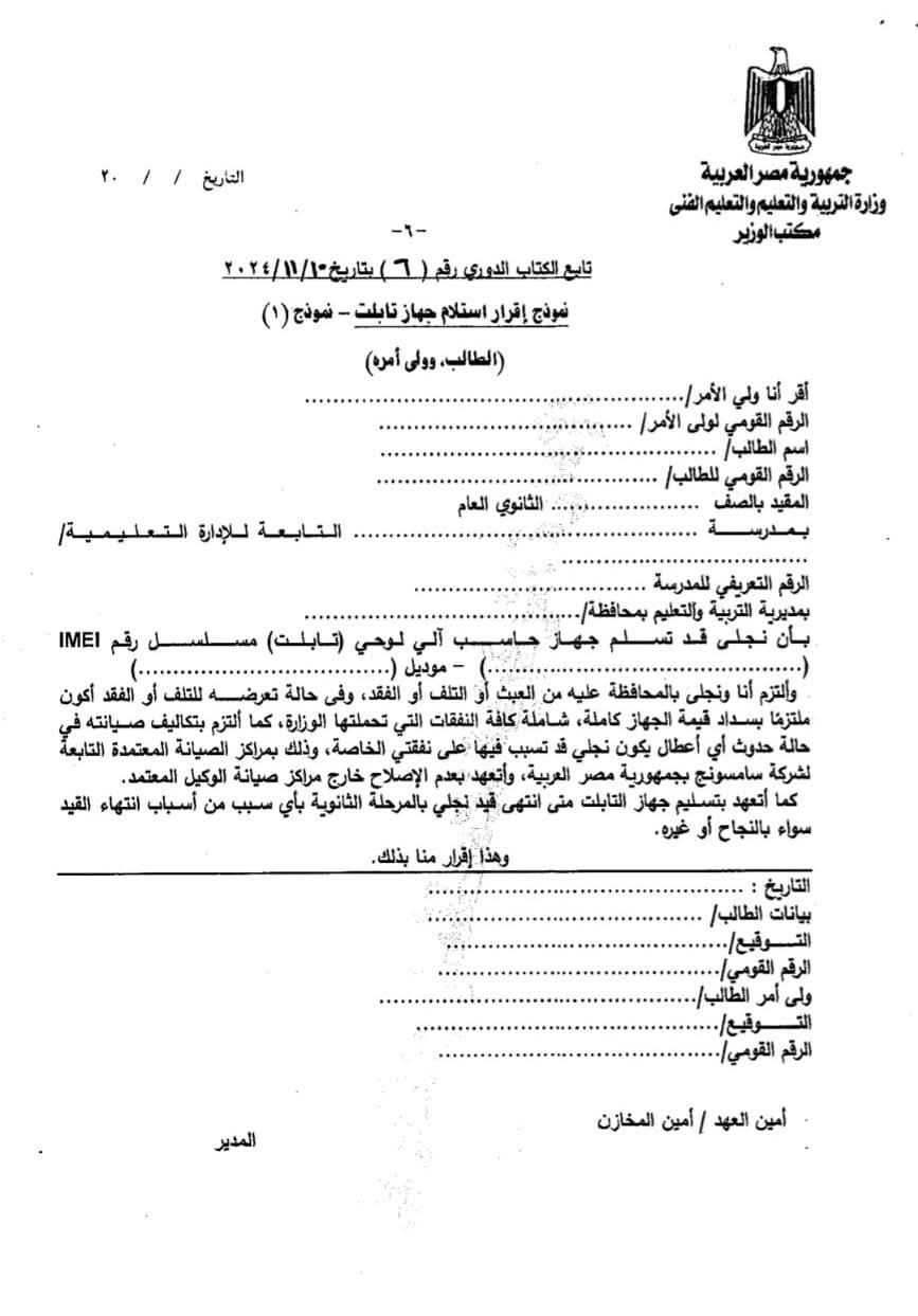 ننشر إقرار استلام تابلت الثانوية العامة 2024