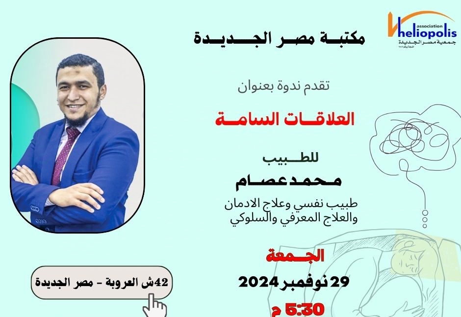 تنظم مكتبة مصر الجديدة العامة في الخامسة والنصف من مساء غد الجمعة، ندوة ثقافية بعنوان "العلاقات السامة"، وهي تلك التي ينتهي بك الأمر فيها إلى المعاناة أو الشعور بالتعاسة مما يؤدي إلى ظهور أعراض القلق وكآبة.