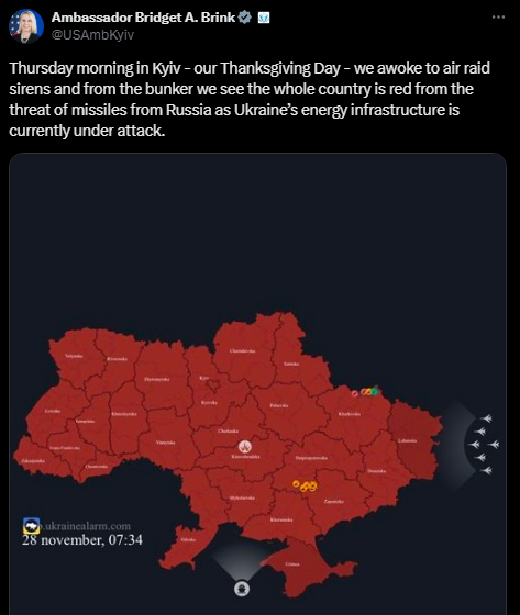 وقالت السفيرة برينك في منشور عبر صفحتها عبر منصة "إكس"، "صباح الخميس في كييف - يوم الشكر لدينا - استيقظنا على صفارات الإنذار من الغارات الجوية، ومن المخبأ نرى أن البلاد بأكملها أصبحت حمراء بسبب التهديد بالصواريخ من روسيا حيث تتعرض البنية التحتية للطاقة في أوكرانيا حاليا للهجوم