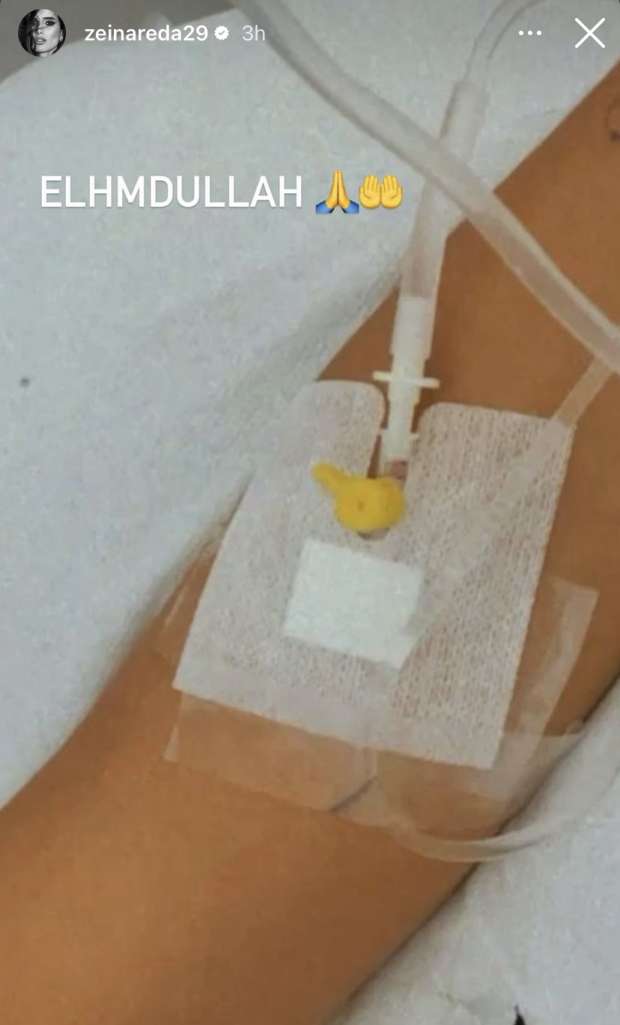 وشاركت زينة جمهورها بصورة لها من داخل المستشفى، وظهرت خلال الصورة تضع في يدها كانيولا، وعلقت عليها قائلة: "الحمدلله".