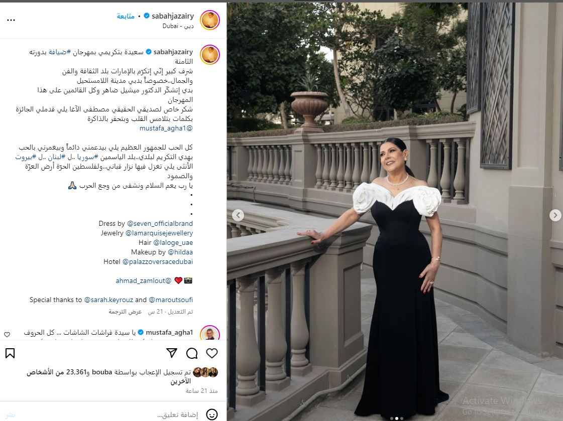 وعلقت على صور إطلالتها التي شاركت متابعيها بها عبر حسابها الشخصي بموقع الإنستجرام، قائلة: "سعيدة بتكريمي بمهرجان ضيافة بدورته الثامنة، شرف كبير إنّي إتكرّم بالإمارات بلد الثقافة والفن والجمال،خصوصا بدبي مدينة اللامستحيل".