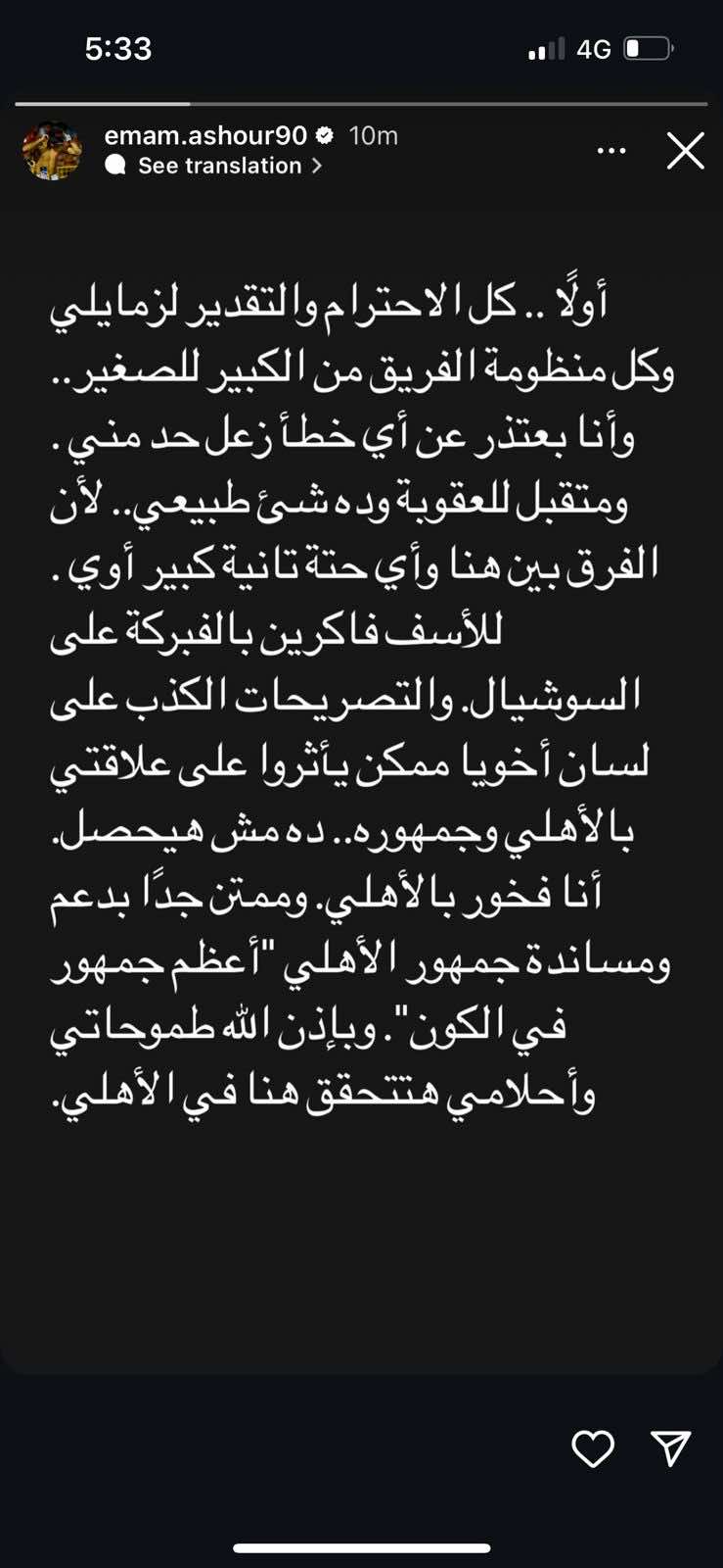 وونشر عاشور على صفحته الرسمية بموقع إنستجرام: "أولًا كل الاحترام والتقدير لزمايلي ولكل منظومة الفريق من الكبير للصغير، وأنا بعتذر عن أي خطأ زعل حد منى، ومتقبل للعقوبة وده شيء طبيعي".