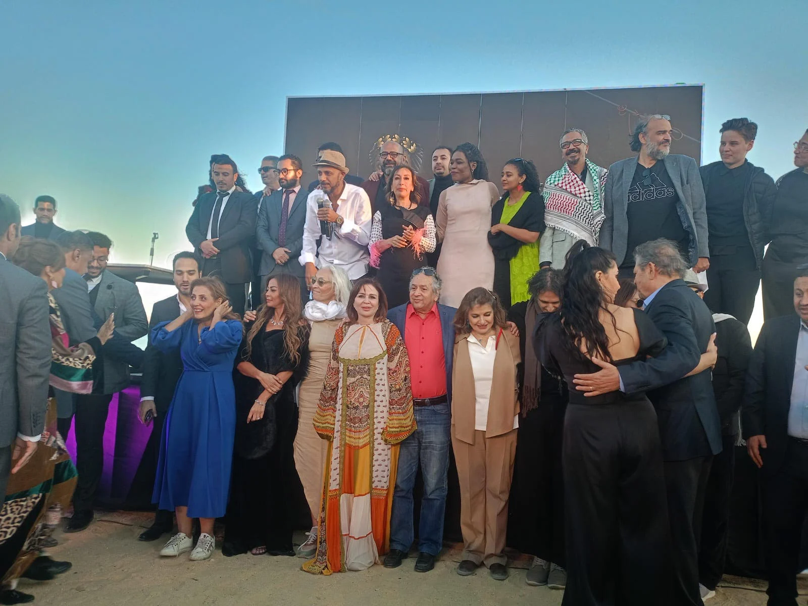 حرص الفنانون والمنظمون علي إلتقاط الصور الجماعية في حفل ختام الدورة الأولى من مهرجان الفيوم السينمائي الدولي لأفلام البيئة والفنون المعاصرة بوادي الريان.
