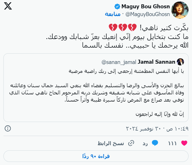 في الوقت نفسه، نعت الفنانة ماغي بو غصن، زوجة جمال سنان، وفاة شقيق زوجها معبرة عن ألمها وحزنها الشديدين على رحيله، وذلك خلال منشور عبر خسابها الشخصي بمنصة التغريدات المصغرة "إكس"، حيث قالت: "بكّرت كتير ناهي! ما كنت بتخيّل بيوم إنّي إنعيك بعزّ شبابك وأودعك. الله يرحمك يا حبيبي، نفسك بالسما".