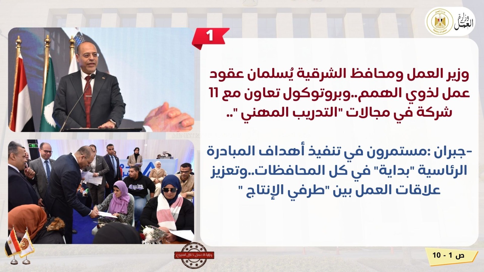 وخلال الأسبوع، استجاب وزير العمل محمد جبران، لطلب مواطن من ذوي الهمم "إعاقة بصرية"، موجها مديرية عمل الجيزة، بسرعة توفير فرصة عمل له.