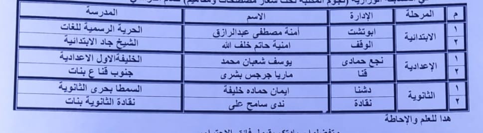 وجاءت نتيجة المسابقة بتأهل آمنة مصطفى بإدارة ابوتشت التعليمية مركز أول و أمنية حاتم إدارة الوقف المركز الثاني عن المرحلة الابتدائية ، و يوسف شعبان بإدارة نجع حمادي مركز أول وماريا جرجس إدارة قنا مركز ثاني عن المرحلة الإعدادية ، بينما حصلت ايمان حمادة على المركز الأول بإدارة دشنا التعليمية و ندى سامح بإدارة نقادة مركز ثاني عن المرحلة الثانوية .