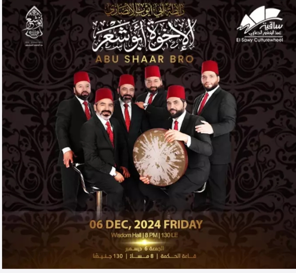 تستقبل ساقية عبد المنعم الصاوي، حفل إنشاد ديني لفرقة الإخوة أبو شعر، مساء يوم الجمعة ٦ ديسمبر المقبل، في تمام الساعة الثامنة مساء بقاعة الحكمة.