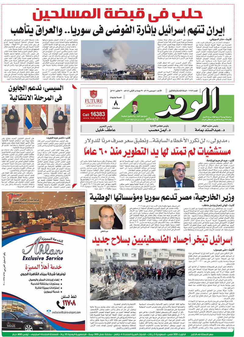 تنشر جريدة الوفد في عددها الصادر غدًا الأحد، العديد من الموضوعات والتقارير الإخبارية المهمة، أبرزها: “حلب في قبضة المسلحين”.