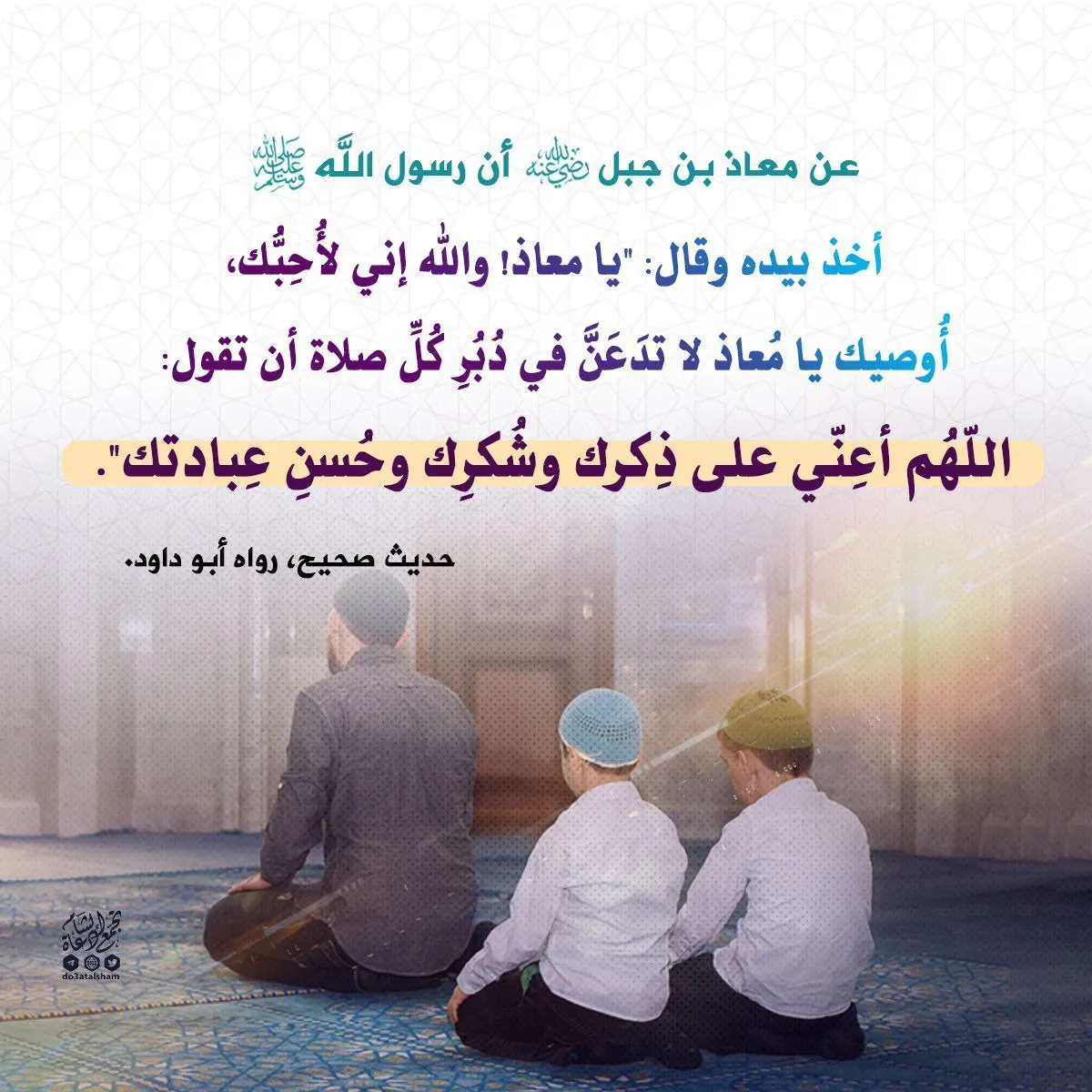 قال معاذ بن جبل رضي الله عنه: "أن رسول الله صلى الله عليه وسلم أخذ بيدي، وقال: يا معاذ، والله إني لأحبك، والله إني لأحبك، فقال معاذ: "أوصيك يا معاذ لا تدعَنَّ في دبر كل صلاة أن تقول: اللهم أعني على ذكرك وشكرك وحسن عبادتك". (رواه أبو داود).