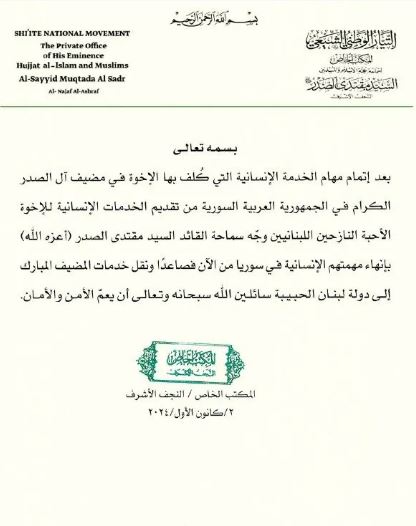 وقال مقتدى الصدر، إنه أتم مهامه الخدمة الإنسانية التي كلف بها في سوريا، من تقديم الخدمات الإنسانية للنازحين اللبنانيين، موجهًا بإنهاء مهمته الإنسانية ونقل خدماته إلى لبنان .