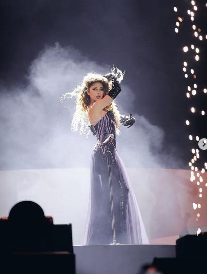 وتألقت ميريام فارس بإطلالة ساحرة، تمزج بين الأناقة والجاذبية في آن واحد، حيث ارتدت فستانًا طويلًا مجسمًا، بقفازات طويلة، ينتمي لقصة الكب، صمم من قماش الترتر باللونين الأسود في الفضي، لتخطف الأنظار بالاستعراضات المتوهجة التي اشتعلت بها اجواء الحفل، ليطلق عليها " ملكة المسرح".