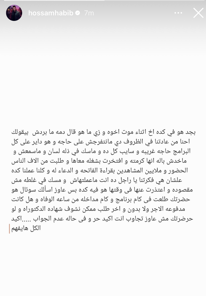 وكتب حسام حبيب عبر ستوري حسابه على إنستجرام: