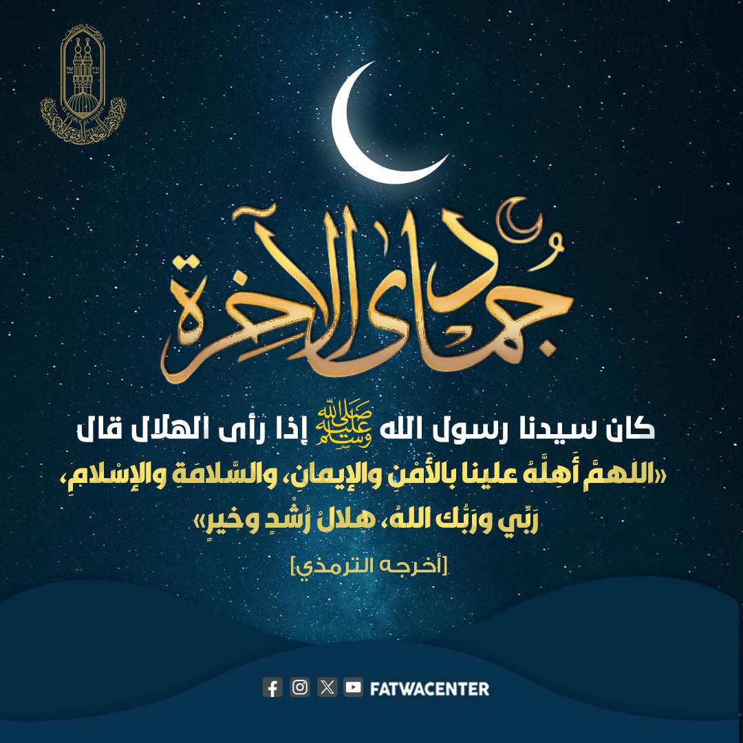 يُهنئ مركز الأزهر العالمي للفتوى الإلكترونية الشعب المصري بغرة شهر جمادي الآخرة غدًا، وذلك وفقًا لنتائج استطلاع هلال شهر جمادي الآخرة لعام 1446 هـ بواسطة اللجان الشرعية والعلمية المنتشرة في مختلف أنحاء الجمهورية، حيث أعلنت الجهات الفلكية والمراصد الشرعية أن غدًا الثلاثاء الموافق 3 ديسمبر 2024م هو أول أيام شهر جمادى الآخرة لعام 1446 هـ، وذلك بعد ثبوت رؤية الهلال مساء اليوم الإثنين.