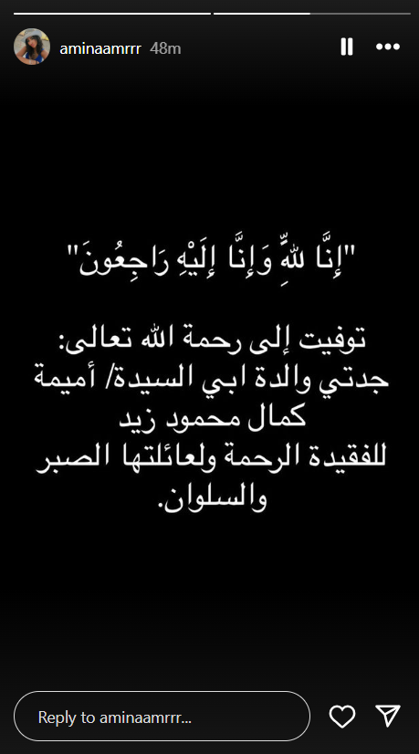 أعلنت “أمينة” ابنة الفنانة نسرين أمين عن وفاة جدتها السيدة أميمة كمال محمود زيد، وذلك خلال منشور شاركته عبر ستوري حسابها الشخصي بموقع تبادل الصور والفيديوهات “انستجرام”.