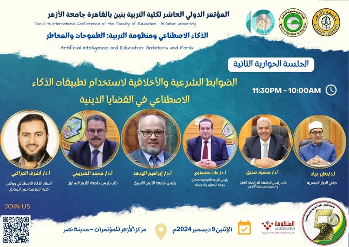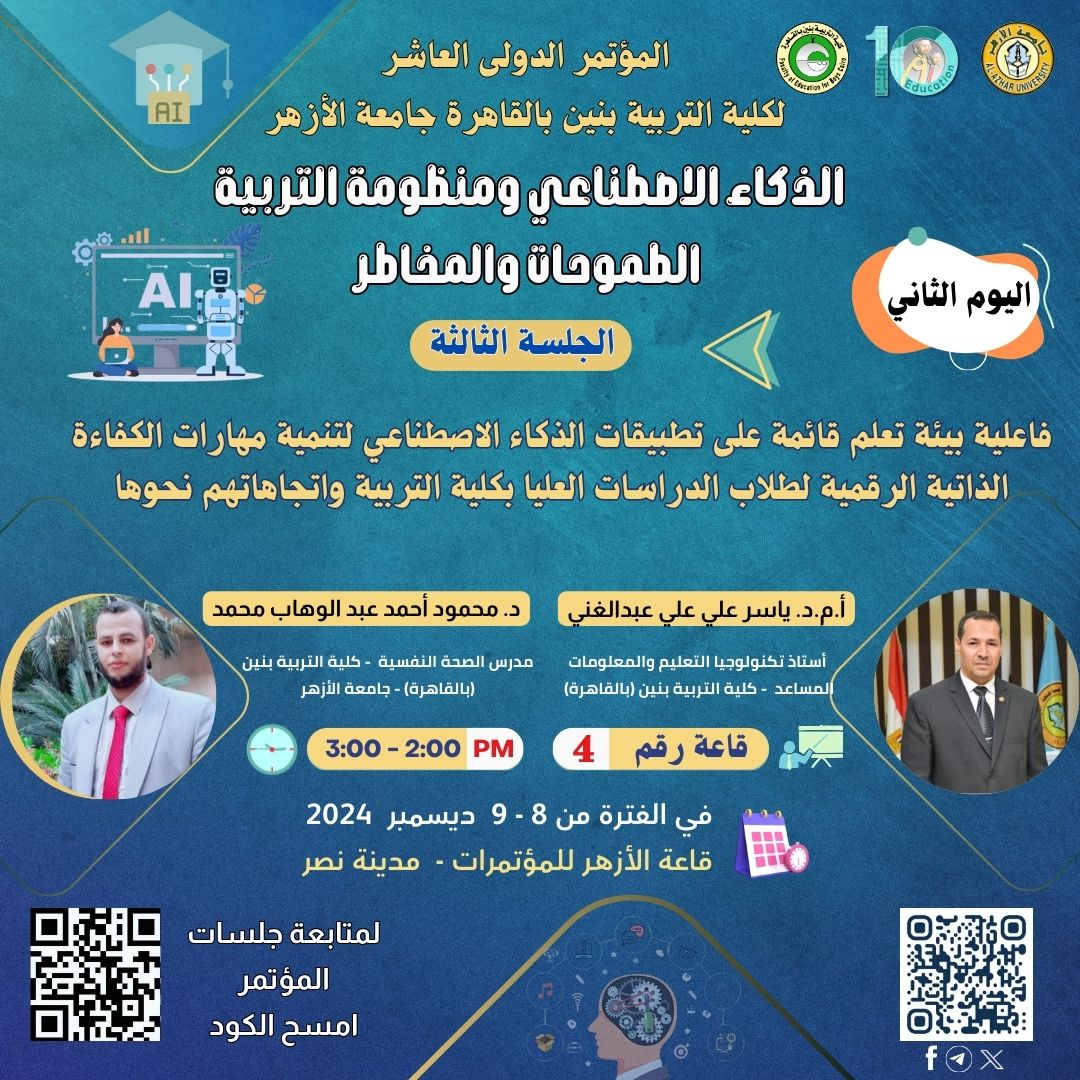 من بين الجلسات الرئيسية في المؤتمر، ستناقش دراسة بعنوان "فاعلية بيئة تعلم قائمة على تطبيقات الذكاء الاصطناعي لتنمية مهارات الكفاءة الذاتية الرقمية لطلاب لطلاب الدراسات العليا بكلية التربية"  يقدمها الأستاذ الدكتور ياسر علي البدرشيني، أستاذ تكنولوجيا التعليم والمعلومات بكلية التربية بنين بالقاهرة.