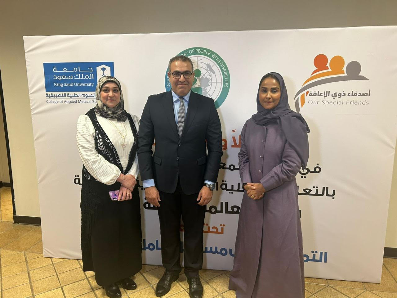 جاء ذلك بمشاركة لفيف من القيادات من جامعة الملك سعود بالمملكة العربية السعودية، وجمعية أصدقاء ذوي الهمم، وذلك بمقر كلية العلوم الطبية التطبيقية بجامعة الملك سعود.