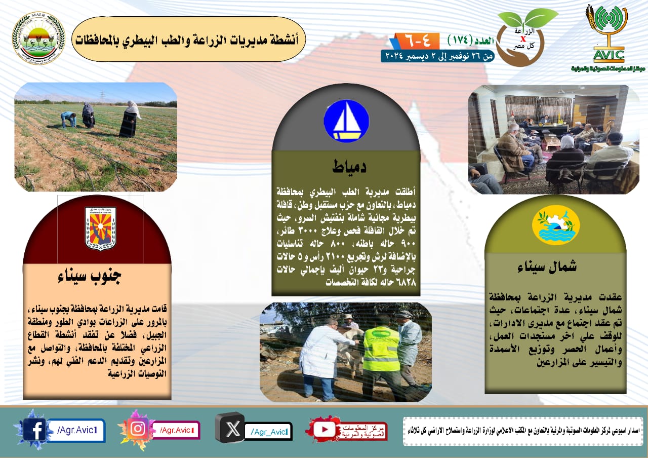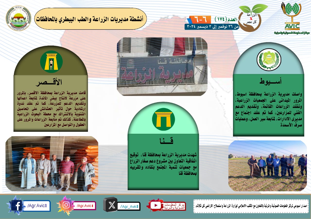 أصدر مركز المعلومات الصوتية والمرئية التابع لوزارة الزراعة واستصلاح الأراضي، والمكتب الإعلامي للوزارة، العدد رقم 174 من اصدار: "الزراعة في كل مصر" بالإنفوجراف والفيديو، يوضح الجهود والانشطة التي تقوم بها مديريات الزراعة والطب البيطري بمحافظات الجمهورية خلال الفترة من 26 نوفمبر حتى 2 ديسمبر الجاري.