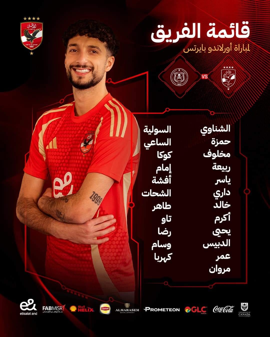 حدد السويسري مارسيل كولر قائمة النادي الأهلي، التي اختارها المدير الفني للفريق الأحمر، لخوض مباراته المرتقبة التي تجمعه أمام نظيره أورلاندو بايرتس الجنوب أفريقي ضمن منافسات دوري أبطال أفريقيا.