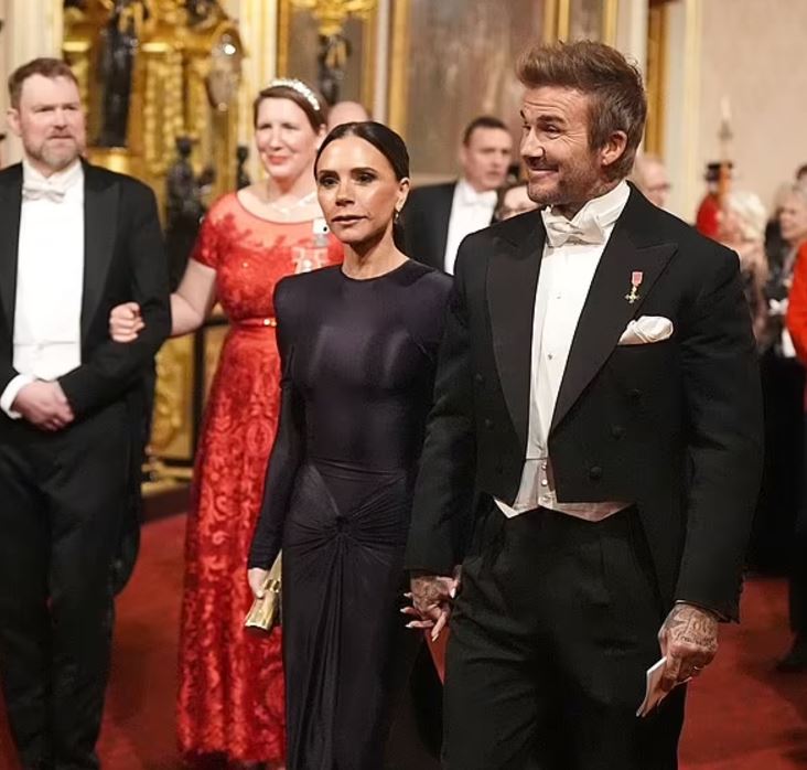 وتألق النجم السابق لكرة القدم، البالغ من العمر 49 عامًا، في قصر باكنجهام، ورافق زوجته، فيكتوريا البالغة من العمر 50 عامًا، التي ظهرت متوترة أثناء مرورها عبر المعرض الشرقي محاطة بالعائلة المالكة والدبلوماسيين.