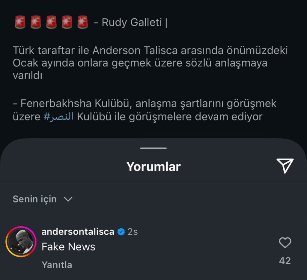 بدوره، نفى البرازيلي أندرسون تاليسكا عبر موقع التواصل الاجتماعي “انستجرام” أنباء انتقاله إلى نادي فنربخشة التركي، قائلًا: “أخبار غير حقيقية”.