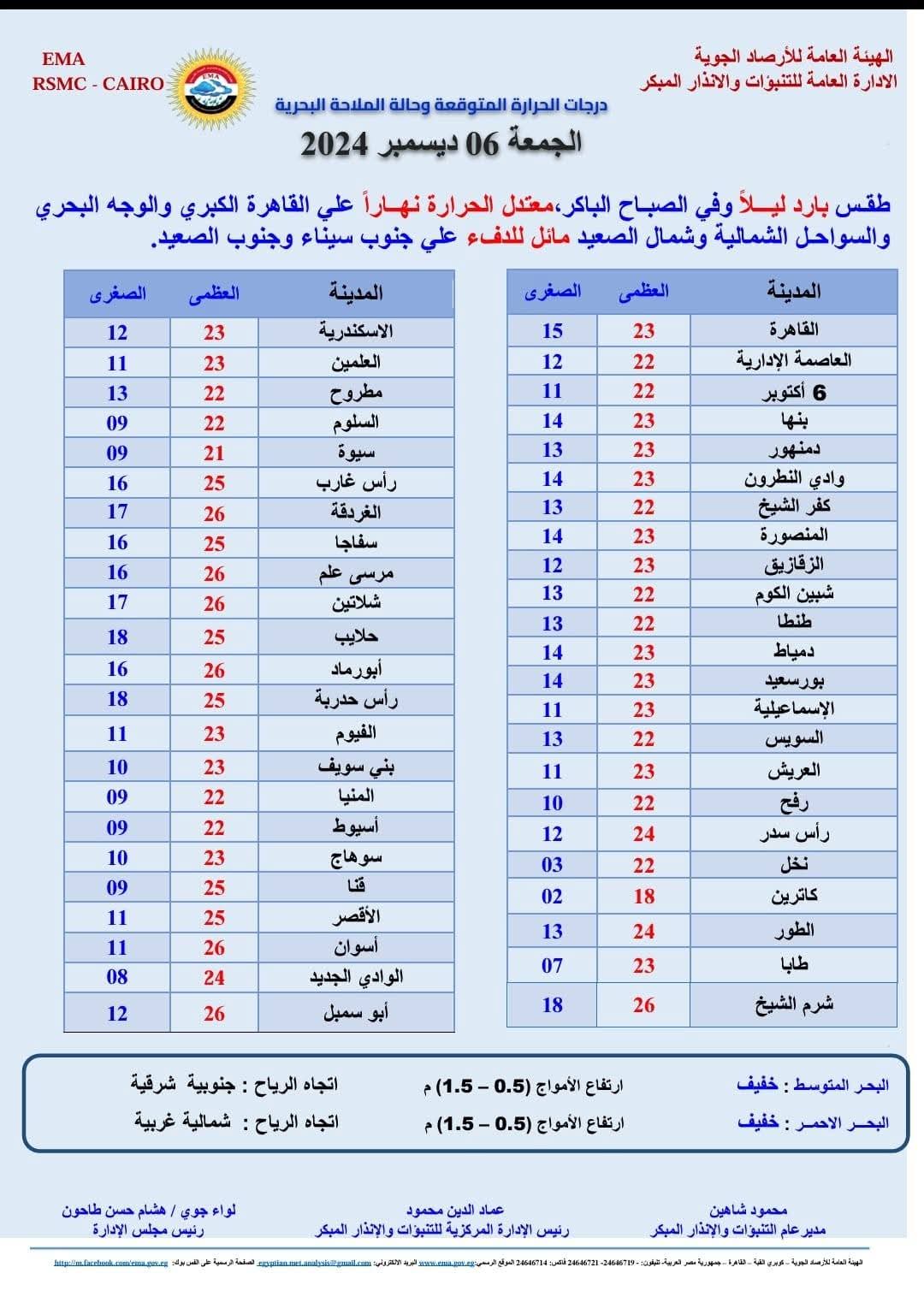 درجات الحرارة وحالة الطقس.. يشهد اليوم الجمعة الموافق 6 ديسمبر، طقس معتدل الحرارة نهارًا على القاهرة الكبرى والوجه البحري والسواحل الشمالية وشمال الصعيد مائل للدفء على جنوب سيناء وجنوب الصعيد، ويكون بارد في الصباح الباكر والليل.