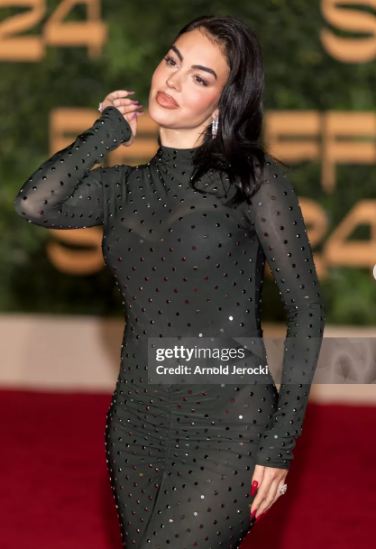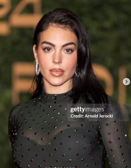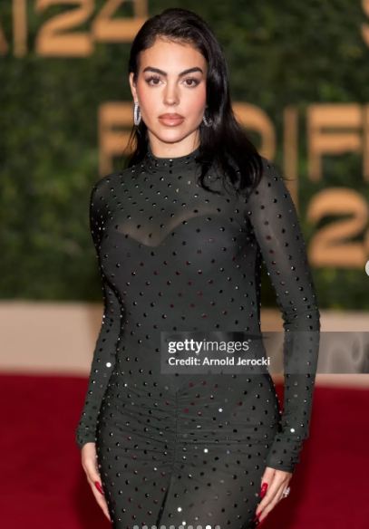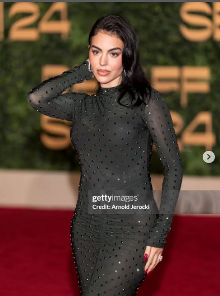 وظهرت جورجينا بإطلالة لافته، حيث ارتدت فستانًا طويلًا مجسمًا، بأكمام طويلة، صمم من قماش التل المطرز بحبات الكريستال الصغيرة؛ لتستعرض قوامها الرشيق، فيما انتعلت صندلًا بكعب عال.