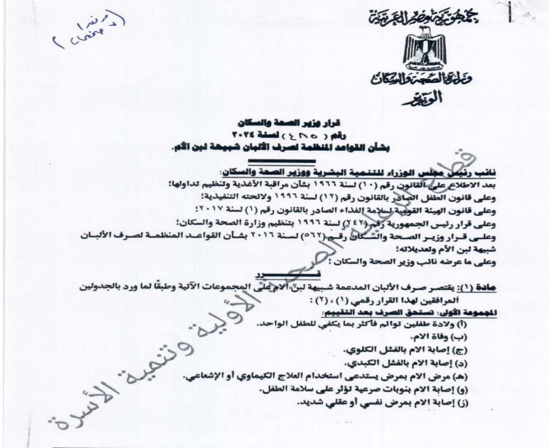 واستثنى القرار بعض الحالات مثل الأطفال كريم النسب، حيث يتطلب صرف الألبان تقديم شهادة ميلاد أو وفاة رسمية، أو محضر شرطة في حالة العثور على الطفل.