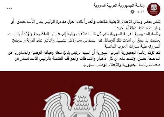 وقالت الرئاسة السورية عبر حسابها الرسمي في بيانها: تنشر بعض وسائل الإعلام الأجنبية شائعات وأخباراً كاذبة حول مغادرة الرئيس بشار الأسد دمشق، أو زيارات خاطفة لدولة أو أخرى.