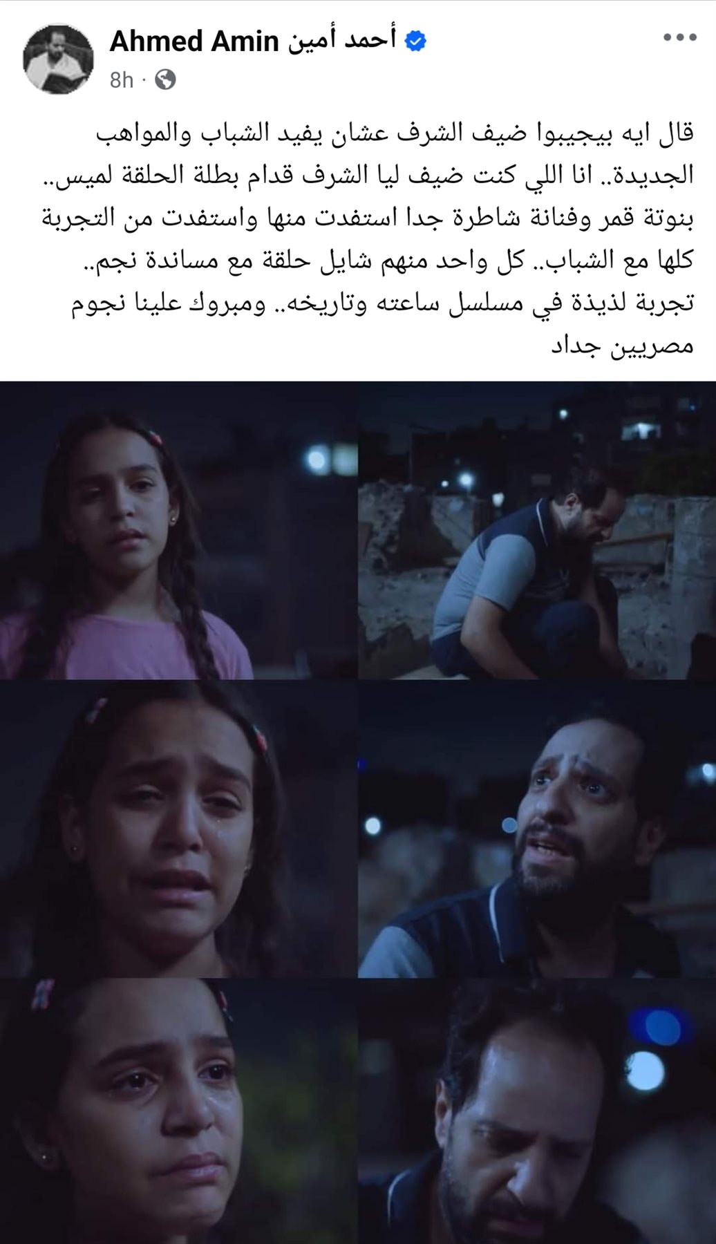 وكتب أحمد أمين، عبر صفحته قائلًا: "قال ايه بيجيبوا ضيف الشرف عشان يفيد الشباب والمواهب الجديدة.. انا اللي كنت ضيف ليا الشرف قدام بطلة الحلقة لميس.. بنوتة قمر وفنانة شاطرة جدا استفدت منها واستفدت من التجربة كلها مع الشباب".