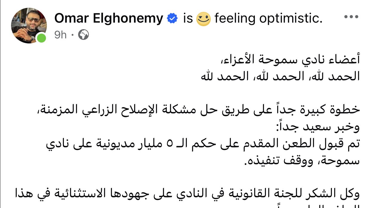 أما بالنسبة لمجلس الادارة فلقد أكتفى الدكتور عمر خميس الغنيمي نائب رئيس النادى بنشر منشور على صفحته الشخصية موجها حديثه لأعضاء النادى وللجنة الاستشارية القانونية جاء فيه " أعضاء نادى سموحة الاعزاء .. الحمدلله الحمدلله الحمدلله خطوة كبيرة جدا على طريق حل مشكلة الاصلاح الزراعى المزمنة وخبر سعيد جدا تم قبول الطعن المقدم على حكم ال٥ مليار مديونية على نادى سموحة ووقف تنفيذه "حيث ان نائب رئيس النادى هو الذى يتحمل عبء حل ازمة الاصلاح الزراعى مع سموحة يالتنسيق مع اللجنة القانونية