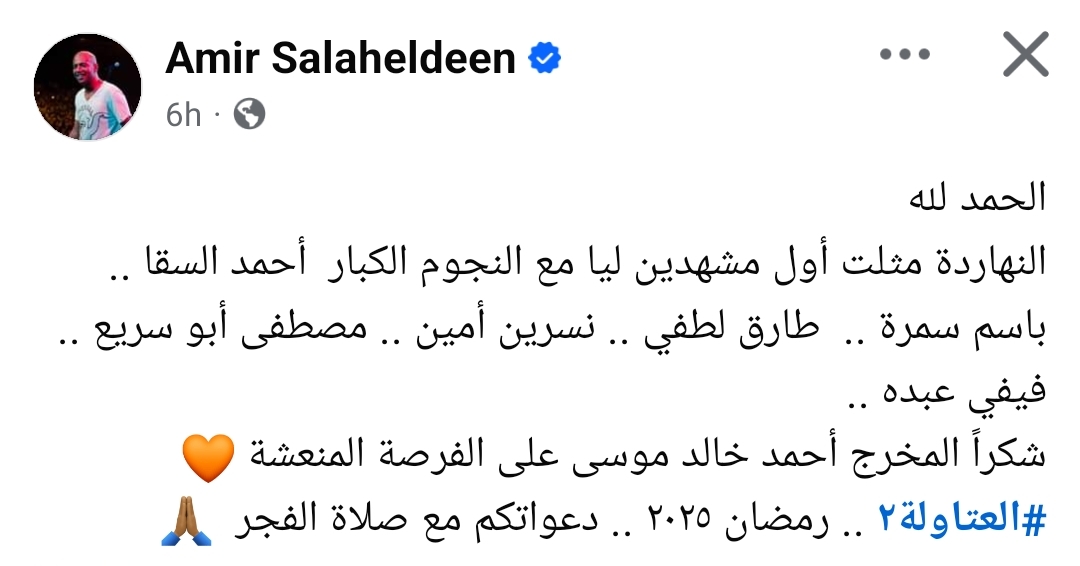 وكتب أمير صلاح الدين، عبر صفحته قائلًا : "الحمد لله النهاردة مثلت أول مشهدين ليا مع النجوم الكبار أحمد السقا، باسم سمرة، طارق لطفي، نسرين أمين، مصطفى أبو سريع، فيفي عبده.. شكرًا المخرج أحمد خالد موسى على الفرصة المنعشة.. العتاولة ٢ رمضان ٢٠٢٥.