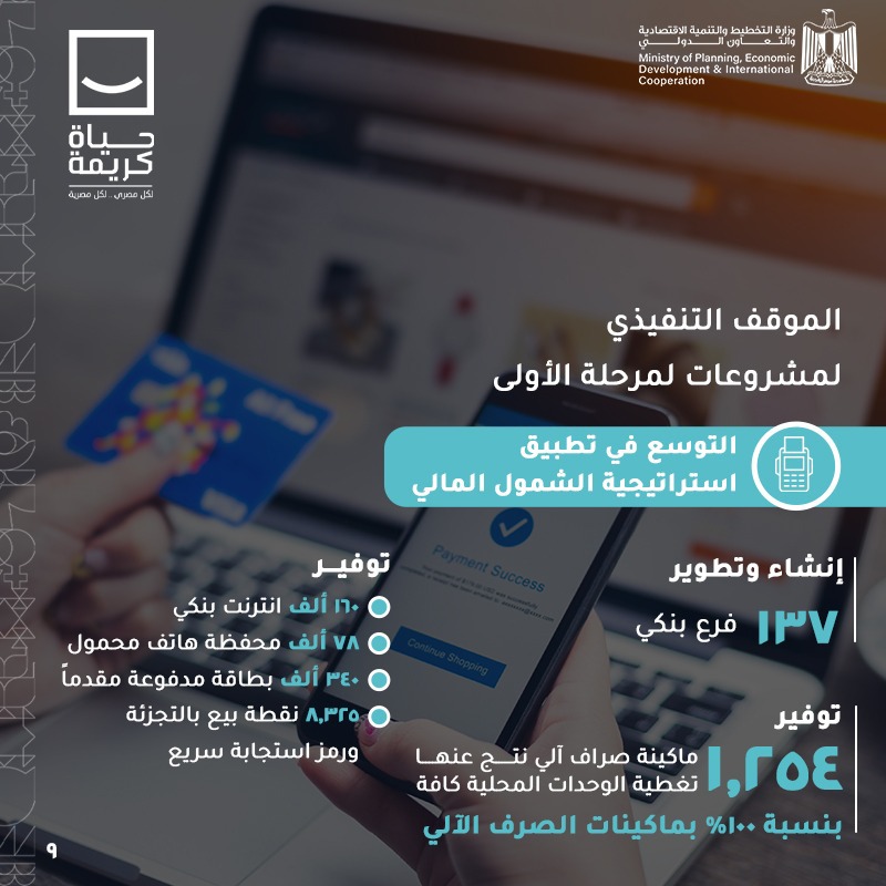 سرد التقرير الموقف التنفيذي للمرحلة الأولى من مشروع "حياة كريمة" في مجال توفير القروض للمشروعات المتوسطة والصغيرة ومتناهية الصغير، حيث تم توفير 65.6 مليار جنيه من مؤسسات التمويل المتنوعة لأكثر من 2.9 مليون مستفيد، وفي إطار التوسع في تطبيق استراتيجية الشمول المالي، تم إنشاء وتطوير 137 فرعًا بنكيًا، وتوفير 1254 ماكينة صراف آلي نتج عنها تغطية الوحدات المحلية كافة بنسبة 100% بماكينات الصرف الآلي، وتوفير 160 ألف انترنت بنكي، وحوالي 78 ألف محفظة هاتف محمول، و340 ألف بطاقة مدفوعة مقدمًا، و8325 نقطة بيع بالتجزئة ورمز استجابة سريع، نتج عنها تحسن مؤشر الشمول المالي بنسبة 11 نقطة مئوية.