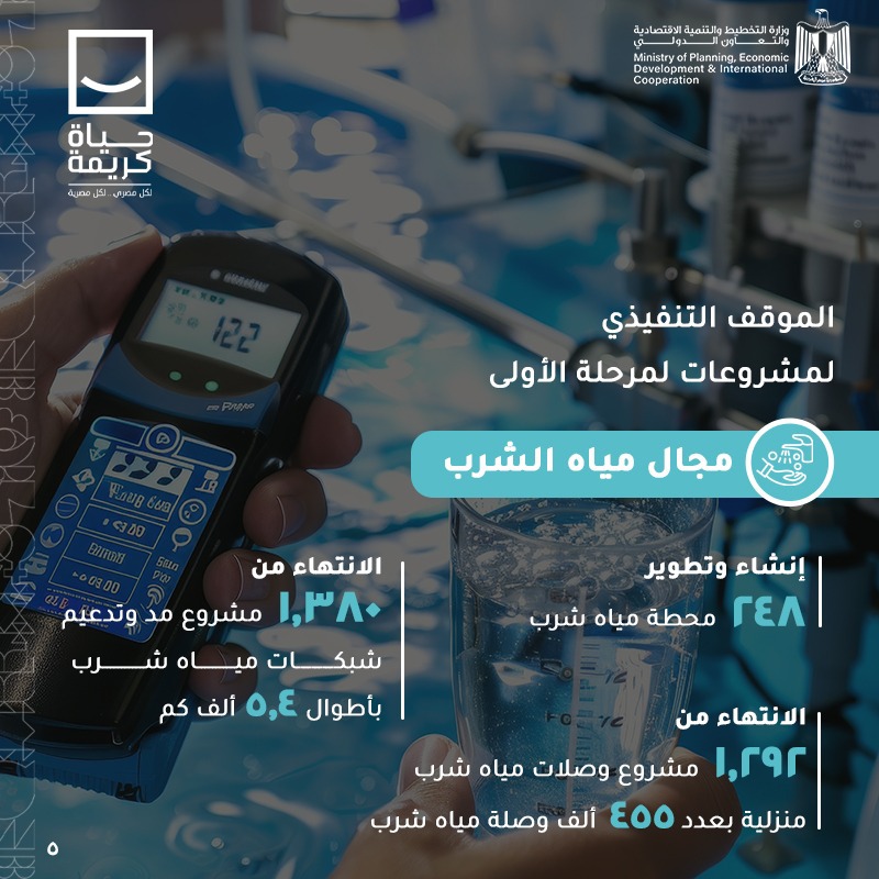 وفي مجال مياه الشرب، أوضح التقرير أنه تم الانتهاء من إنشاء وتطوير 248 محطة مياه شرب، و1380 مشروع مد وتدعيم شبكات مياه شرب بأطوال 5.4 ألف كم، والانتهاء من 1292 مشروع وصلات مياه شرب منزلية بعدد 455 ألف وصلة مياه شرب، لينتج عنها زيادة عدد المشتركين بخدمة مياه الشرب بنسبة 14% في قرى المرحلة الأولى بين عامي 2021 و2024، ومن المستهدف زيادة التغطية بمياه الشرب النقية من 97% إلى 100%.