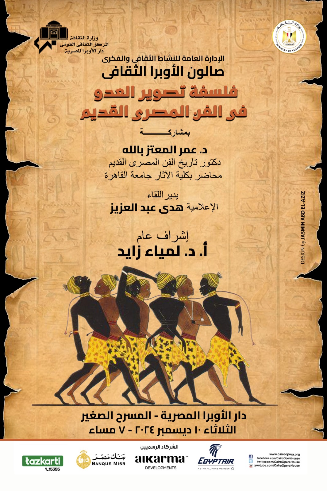 تنظم دار الأوبرا المصرية برئاسة الدكتورة لمياء زايد، في إطار نشاطها الثقافي والفكري صالونًا ثقافيًا بعنوان "فلسفة تصوير العدو في الفن المصري القديم"، في إطار جهود وزارة الثقافة الهادفة إلى تسليط الضوء على التراث الثقافي والفني المصري بمختلف عصوره.