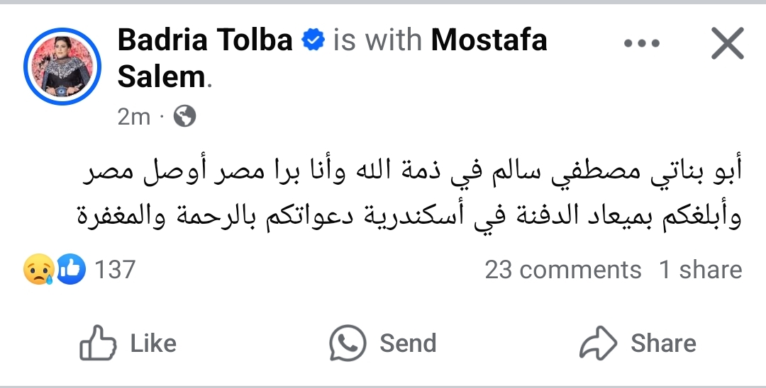 وكتبت بدرية طلبه، عبر صفحتها قائلة : "أبو بناتي مصطفي سالم في ذمة الله وأنا برا مصر أوصل مصر وأبلغكم بميعاد الدفنة في أسكندرية دعواتكم بالرحمة والمغفرة".