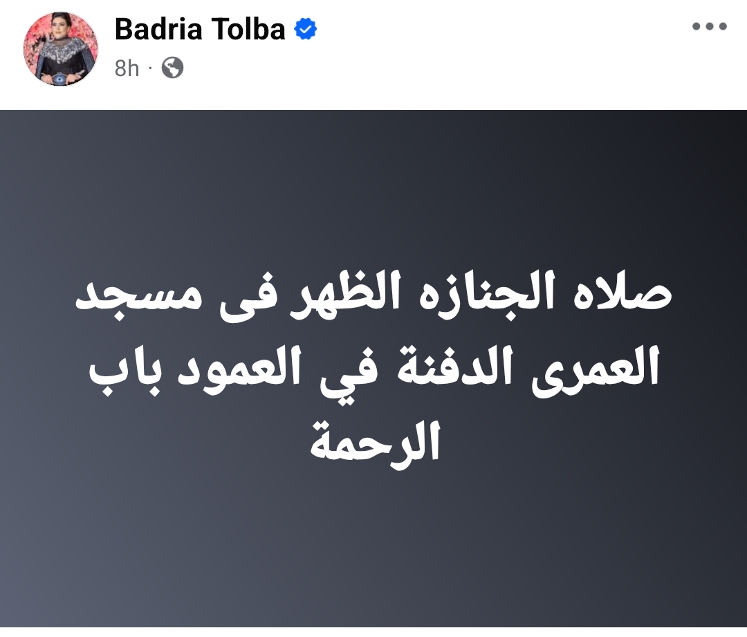 وكتبت بدرية طلبة، عبر صفحتها قائلة : "صلاه الجنازه الظهر فى مسجد العمرى الدفنة في العمود باب الرحمة".