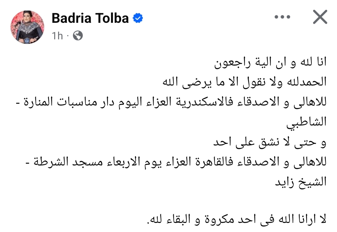 وكتبت بدرية طلبة، عبر صفحتها قائلة : "انا لله و ان الية راجعون.. الحمدلله ولا نقول الا ما يرضى الله.. للاهالى و الاصدقاء فالاسكندرية العزاء اليوم دار مناسبات المنارة - الشاطبي، و حتى لا نشق على احد للاهالي والاصدقاء فالقاهرة العزاء يوم الأربعاء مسجد الشرطة - الشيخ زايد.. لا ارانا الله فى احد مكروة و البقاء لله.