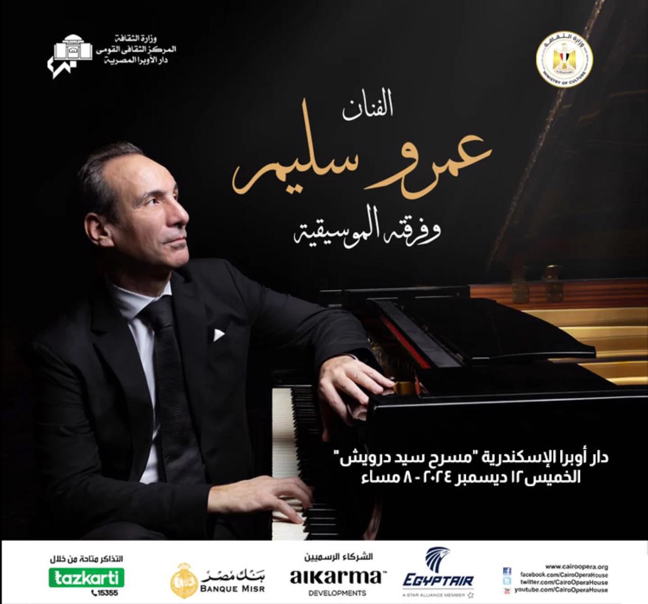 تتواصل الأنشطة المميزة لوزارة الثقافة المصرية، حيث تقيم دار الأوبرا برئاسة الدكتورة لمياء زايد حفلا للموسيقار وعازف البيانو الشهير عمرو سليم وفرقته، في الثامنة مساء الخميس 12 ديسمبر على مسرح سيد درويش "أوبرا الأسكندرية" .