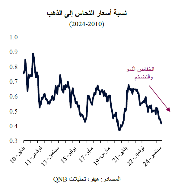 وأوضح QNB أن العامل الثاني، يبدو أن نسبة أسعار النحاس إلى الذهب، وهي مقياس تقليدي لتوقعات النمو والتضخم، وكذلك لمعنويات المخاطرة، تشير إلى بيئة معتدلة خلال الأرباع القادمة. وهذا يتناقض مع الرأي القائل بأن ولاية ترامب الثانية قد تزيد من الناتج المحلي الإجمالي المحتمل والتضخم، مما يعزز بقوة "الرغبة في المخاطرة" لدى المستثمرين. ولو كان الأمر كذلك، لارتفعت أسعار النحاس بوتيرة أسرع من أسعار الذهب، مما يؤدي إلى زيادة نسبة أسعار النحاس إلى الذهب. بدلاً من ذلك، حدث العكس. ويشير هذا الأمر، إذا نظرنا فقط إلى أسواق السلع الأساسية ودينامياتها، إلى توقعات بانخفاض الضغوط التضخمية مع نمو معتدل.
