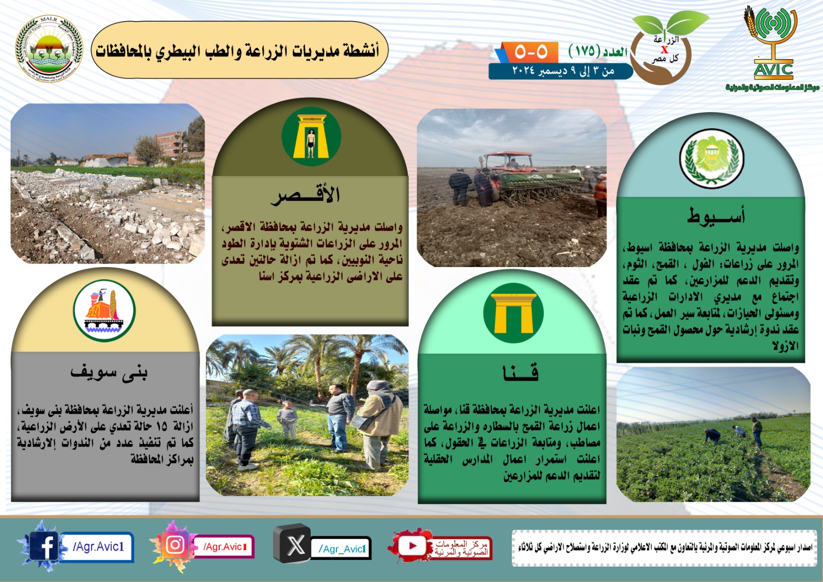 أصدر مركز المعلومات الصوتية والمرئية التابع لوزارة الزراعة واستصلاح الأراضي، والمكتب الاعلامي للوزارة، العدد رقم 175 من اصدار: "الزراعة في كل مصر" بالانجراف والفيديو، يوضح الجهود والانشطة التي تقوم بها مديريات الزراعة والطب البيطري بمحافظات الجمهورية خلال الفترة من 3 وحتى 9 ديسمبر الجاري.