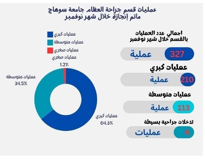 واوضح الدكتور احمد صالح رئيس قسم جراحة العظام ان الفريق الطبي بالقسم نجح خلال شهر نوفمبر في اجراء حوالي ٣٢٧ عملية جراحية منهم ٢١٠ عملية جراحية كبري، و١١٣ عملية جراحية متوسطه، الي جانب ٤ عمليات صغري.