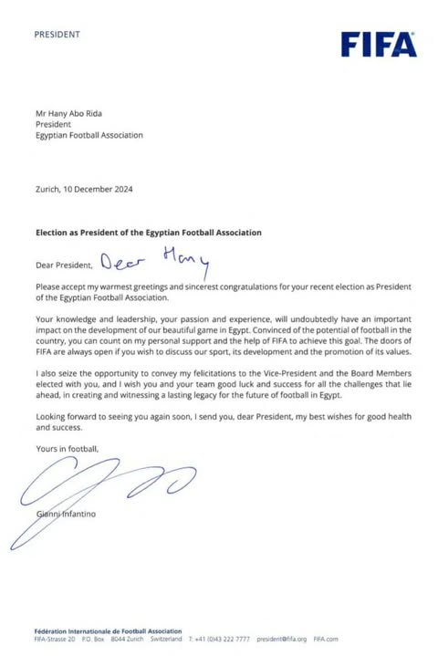 وقال إنفانتينو في خطابه لرئيس اتحاد الكرة المصري الجديد، إنه يثق في أن خبرته وقيادته ستقود الكرة المصرية واللعبة الشعبية الأولى إلى التطور والتقدم، وأن وجوده على رأس قيادة الكرة في مصر، ستساعد الفيفا على تحقيق أهدافها في تطوير اللعبة في مصر، وأبواب الفيفا مفتوحة دائما أمامه لمناقشة أي تطوير في كرة القدم مستقبلا بخوص الكرة المصرية.