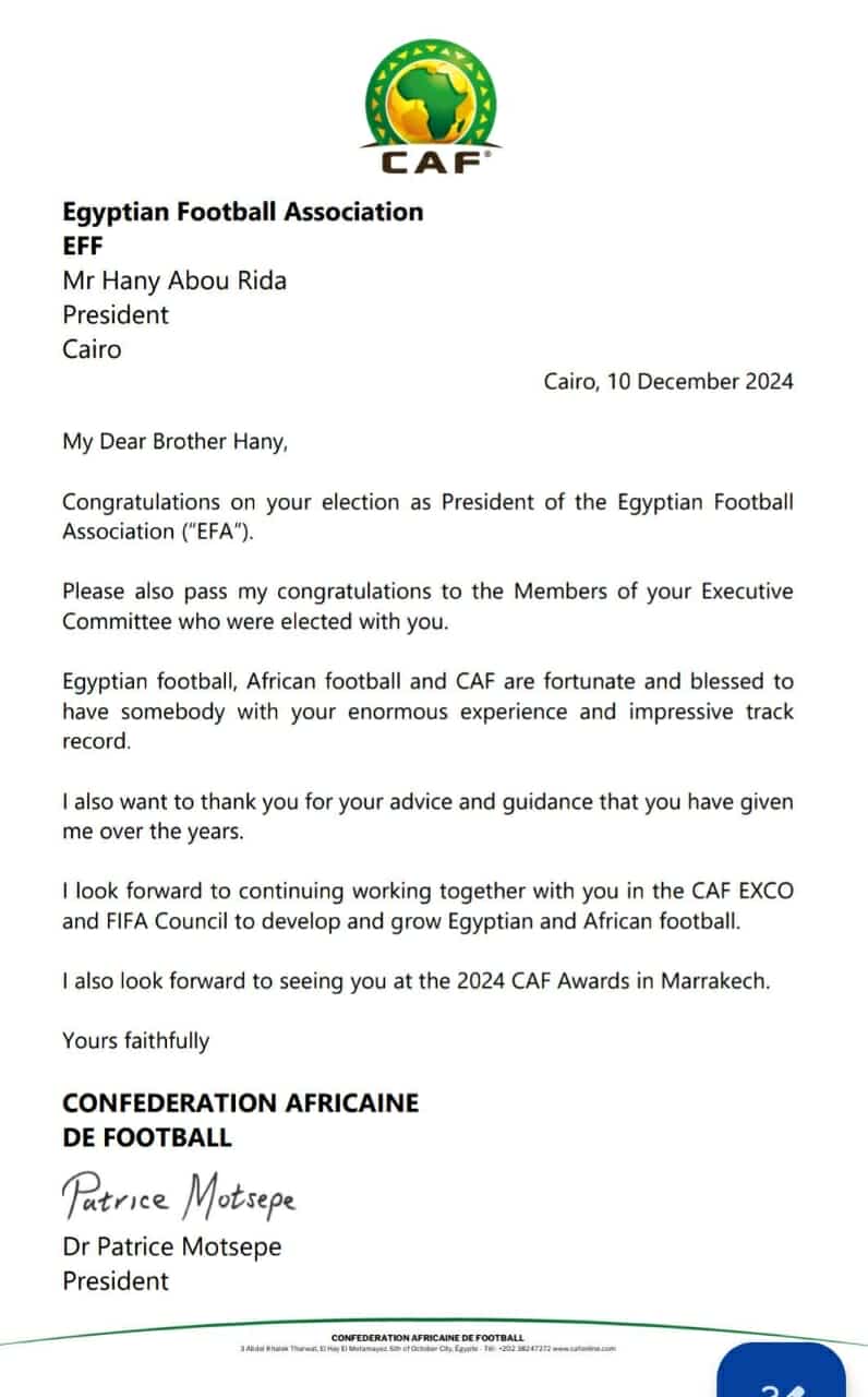تقدم السويسري جياني إنفانتينو رئيس الاتحاد الدولي لكرة القدم، فيفا، والجنوب أفريقي باتريس موتسيبي رئيس الاتحاد الأفريقي لكرة القدم، بالتهنئة للمهندس هاني أبوريدة، عضو مجلس الفيفا والمكتب التنفيذي للكاف، بانتخابه هو وقائمته لقيادة اتحاد الكرة المصري خلال السنوات الأربعة المقبلة وحتى عام ٢٠٢٨.