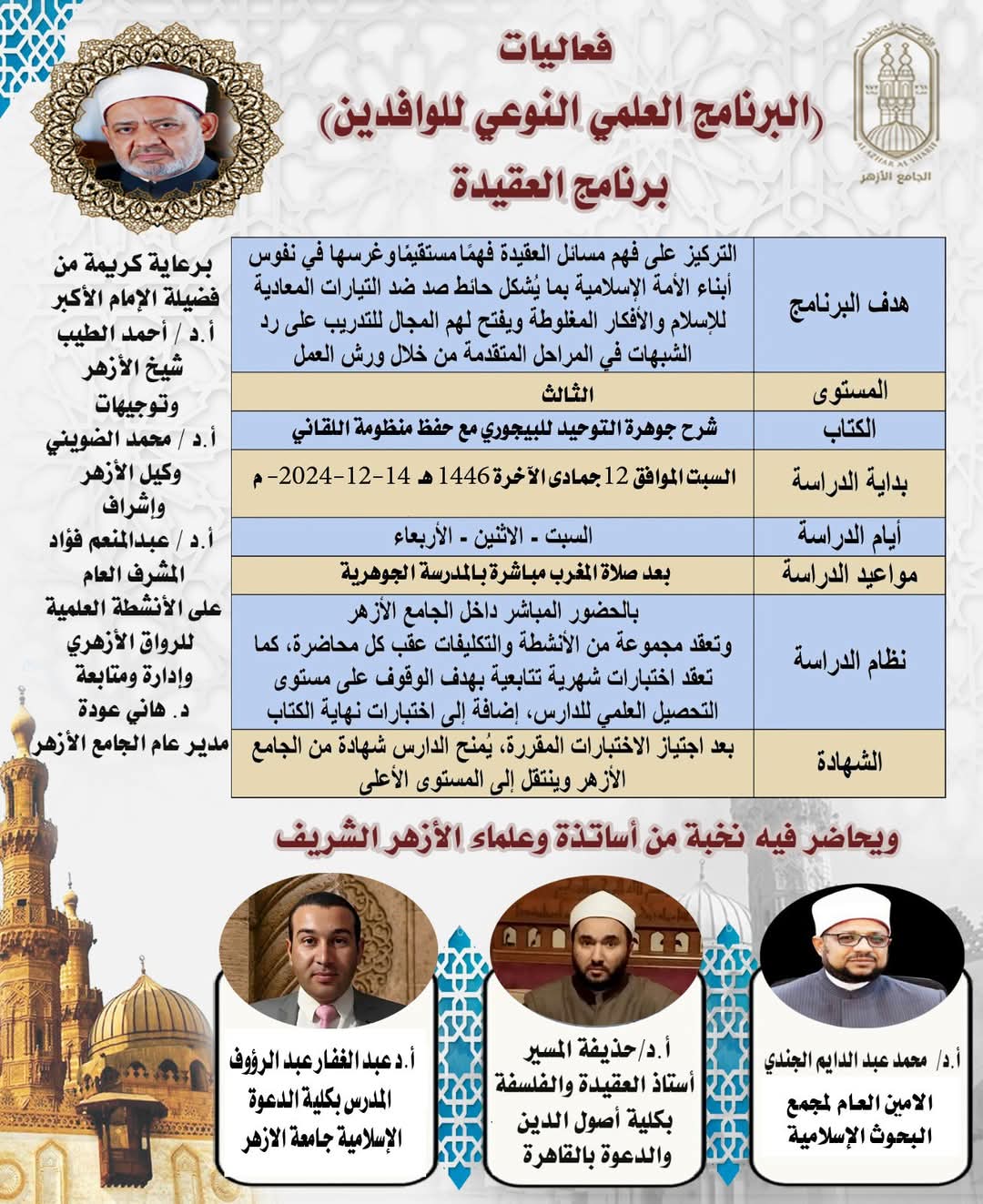 وفي هذا المستوى يتم شرح كتاب"جوهرة التوحيد للبيجوري مع حفظ منظومة اللقاني"، ويحاضر في هذا المستوى: الدكتور محمد الجندي، الأمين العام لمجمع البحوث الإسلامية، والدكتوى حذيفة المسير، أستاذ العقيدة والفلسفة المساعد بكلية أصول الدين بالقاهرة، والدكتور عبد الغفار عبد الرؤوف حسن، المدرس بكلية الدعوة الإسلامية بالقاهرة، وتهدف الدراسة إلى تعزيز قدرات الطلاب على التعامل مع كتب التراث في مختلف المجالات، ومن خلال الدراسة في برنامج العقيدة، يستطيع الطلاب فهم مسائل العقيدة فهماً مستقيماً وغرسها في نفوس أبناء الأمة الإسلامية بما يشكل حائط صد ضد التيارات المعادية للدين الإسلامي.
